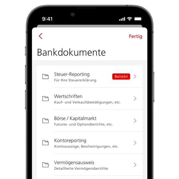 Wählen Sie unter Kategorie den Eintrag Steuer-Reporting (für Kontobescheinigungen, Steuerauszüge) oder Hypotheken (für Schuldner-Anzeigen).