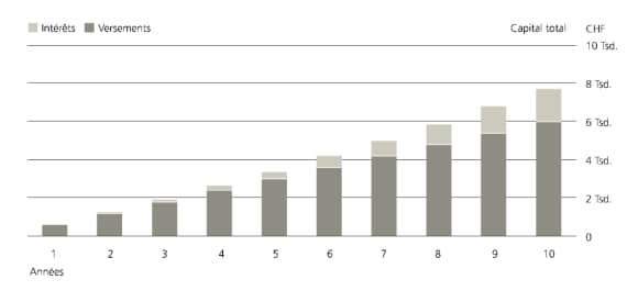 Calcul: vous investissez 50 CHF chaque mois pendant dix ans. En moyenne, vous réalisez un bénéfice annuel (aussi appelé «rendement» ou «revenus du capital») de 5%. Après dix ans, vous vous êtes constitué un capital de 7764 CHF. 6000 CHF proviennent de vos versements mensuels et 1764 CHF sont les revenus issus de votre placement. La part des revenus sur le patrimoine total grossit chaque année. C’est ce que l’on appelle l’effet des intérêts composés.