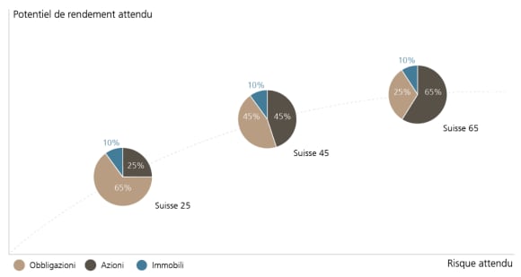 Con gli UBS Suisse Funds vi offriamo la soluzione ideale per ogni esigenza e strategia d’investimento. I fondi si distinguono in base a categorie d’investimento allo scopo di conseguire una diversificazione dei rischi il più ampia possibile. La selezione va dal fondo con una quota azionaria del 25%, adatto a investitori piuttosto prudenti al fondo con una quota azionaria del 65% per investitori orientati alla crescita.