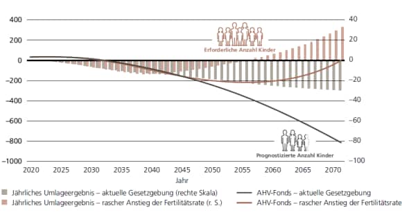 Sich zur Rettung der 1. Säule einzig auf die Demografie zu verlassen, ist gemäss den Autoren unklug. Selbst eine bestenfalls moderate Erholung der Geburtenrate oder erhöhte Migration wäre kaum hilfreich. Ohne Reformen wären etwa fünf Kinder pro Frau nötig, um den AHV-Fonds bis 2070 wieder ins Gleichgewicht zu bringen. UBS-Ökonom James Mazeau sagt: "Eine solch hohe Geburtenrate ist unrealistisch. Ausserdem sollte die Finanzierbarkeit der AHV nicht von der Anzahl Kinder abhängen" (s. Abbildung).