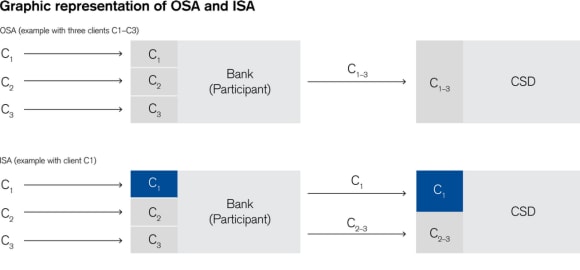 In our own books and records, we record each client's individual entitlement to securities that we hold for that client in a separate client account. We also open accounts with a CSD in our own name (or in our nominee's name) in which we hold clients' securities. As a general rule, we currently make two types of accounts with CSDs available to clients: Individual Client Segregated Accounts (ISAs) and Omnibus Client Segregated Accounts (OSAs).