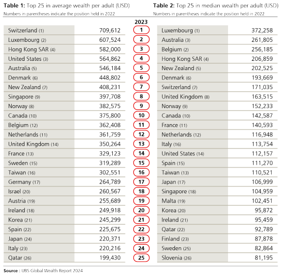 - A livello di singoli mercati, la Svizzera continua a essere al primo posto per quanto riguarda la ricchezza media per adulto, seguita da Lussemburgo, Hong Kong e Stati Uniti.