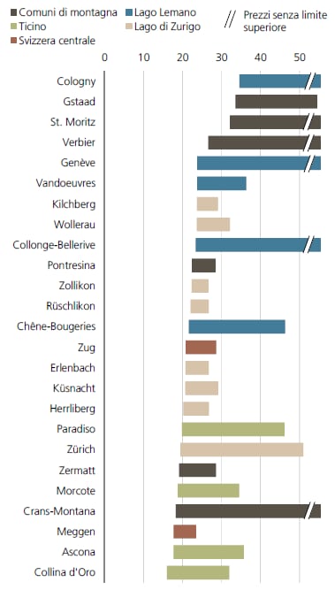 A livello nazionale i prezzi più alti per le abitazioni di proprietà si registrano sul lago di Ginevra. Al vertice della classifica troviamo Cologny, dove gli immobili di lusso si vendono a più di 35 000 franchi al metro quadro di superficie abitabile. Un livello di prezzo analogo si riscontra nelle regioni turistiche di Gstaad e St. Moritz. Sul lago di Zurigo, i prezzi nel segmento di lusso sono leggermente inferiori e oscillano tra i 20 000 e i 30 000 franchi al metro quadro.