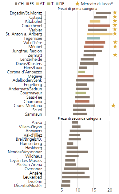 Le barre mostrano la fascia di prezzo degli appartamenti per le vacanze nel segmento di lusso in 1000 CHF (oder ausgeschrieben: mille franchi) al metro quadro.