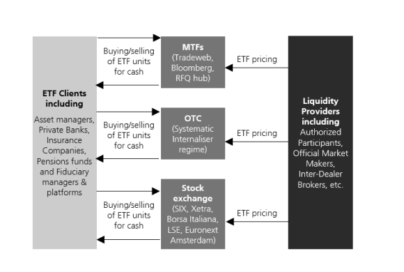 - The vast majority of ETF trading occurs off the primary exchange on dedicated MTF platforms like Tradeweb or Bloomberg RFQE.