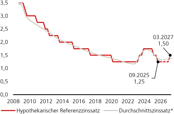 UBS hält einen weiteren Rückgang des Referenzzinssatzes auf 1,0 Prozent in diesem Jahr für unwahrscheinlich. Damit das passieren kann, müsste der durchschnittliche Zinssatz auf unter 1,125 Prozent sinken – ein Niveau, das selbst in der Zeit der Negativzinsen von 2015 bis 2022 nie erreicht wurde. Mittelfristig könnte der Referenzzins im ersten Halbjahr 2027 wieder auf 1,50 Prozent anziehen, falls die Durchschnittszinsen geringfügig zulegen.