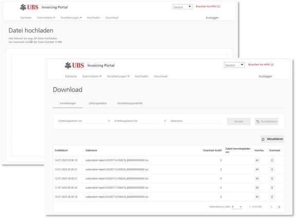 Neben dem manuellen Hoch- und Herunterladen über das Rechnungsportal stehen Ihnen über UBS digitale Rechnung auch andere Kanäle zur Verfügung. Alle Details finden Sie unter ubs.com/digitale-rechnung