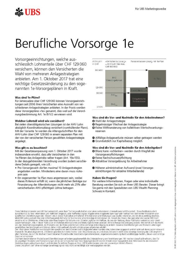Selbstbestimmte berufliche Vorsorge mit freier Wahl der Anlagestrategie – inklusive individueller Beratung für Ihr Unternehmen und Ihre Mitarbeitenden: mit der 1e-Vorsorgelösung der UBS 1e Sammelstiftung haben Sie eine starke Partnerin an Ihrer Seite. Unsere 1e Pläne können nach Ihren Bedürfnissen aufgesetzt werden und Ihr Vorsorgevermögen kann in eine unserer kosteneffizienten Anlagelösungen investiert werden.
