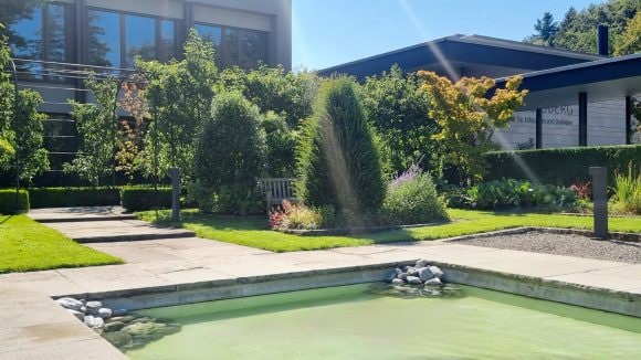Additionally, we have created a flower meadow with an adjacent ruderal area. This area, made up of gravel, wood, and stone elements, as well as a small water feature, provides food and shelter for birds and other small animals. This initiative is further supported by the maintenance of 26 bird nesting boxes, two insect hotels, and entry and exit aids for small animals in the water basins of the English Garden, which have been made accessible through stone piles in the corners.