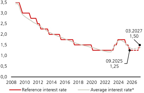 Le taux d’intérêt de référence hypothécaire s’élève à 1,25%. Ce taux est en vigueur depuis le 2 septembre, date à laquelle le taux de référence a baissé de 0,25 point de pourcentage, et devrait rester inchangé jusqu’en mars 2026. La valeur actuelle correspond donc à nouveau au plus bas historique, qui avait déjà été enregistré entre mars 2020 et mars 2023.