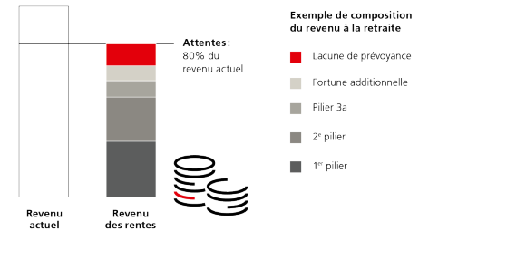 Les prestations des deux premiers piliers doivent couvrir environ 60% du revenu avant le départ à la retraite. Si l’on n’a pas cotisé de manière continue et intégrale, par exemple en raison d’un congé maternité, d’un temps partiel, des congés professionnels ou d’une formation continue, le pourcentage est plus faible.