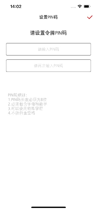 2. 命名完成后,会要求您为令牌设置PIN码。电子密码器的PIN码的规则是8位字符,必须包含字符和字母,可以包括特殊字符。PIN码会保存在您的移动设备端,一旦遗失就无法找回,您需要重新激活电子密码器APP。因此,请妥善保管您的PIN码。
