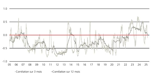 Plus important encore, nous pensons que le comportement du marché des taux suggère qu’il adopte cette position. La corrélation actions-obligations devient de plus en plus négative ces derniers temps. Bien que les droits de douane dopent les anticipations implicites d’inflation à un an du marché, les obligations rebondissent généralement lorsque les craintes liées aux droits de douane donnent lieu à des corrections de marché. Même s’il n’y a rien d’étonnant à ce que les investisseurs se méfient des obligations, étant donné la corrélation généralement positive entre les actions et les obligations observée ces dernières années, les risques de baisse de la croissance ont suffisamment augmenté pour la ramener en territoire négatif (voir la Figure 1).