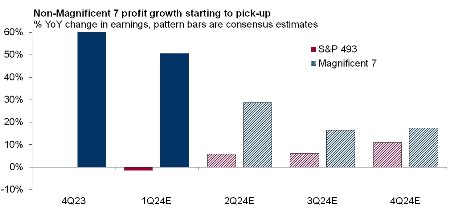 At this point, elevated valuations from mega-cap companies, coupled with an improving earnings growth picture from ex. Mag-7 firms, suggests to CIO that the equity rally is likely to broaden in 2024. In fact, this is already somewhat noticeable.