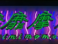 此装置作品以艺术家创作的《梦见游泳池(十二)》(2024–25年)为基础延伸:原作是个圆形、镶嵌马赛克瓷砖的泳池,象征着地球,而《靡靡摩摩池》则将这一意象转化为沉浸式的实体环境。装置的地面铺上印有原作图像的地毯,周边结构铺设鲜艳的马赛克瓷砖,座位内置的电子按摩滚轮则为入座的观众提供舒适体验。色彩亮丽的阳伞环绕泳池四周,为作品整体增添一份游戏般的轻松气氛。此装置回应于巴塞尔展香港展会期间,有关社群、连结以及共享经验等议题。