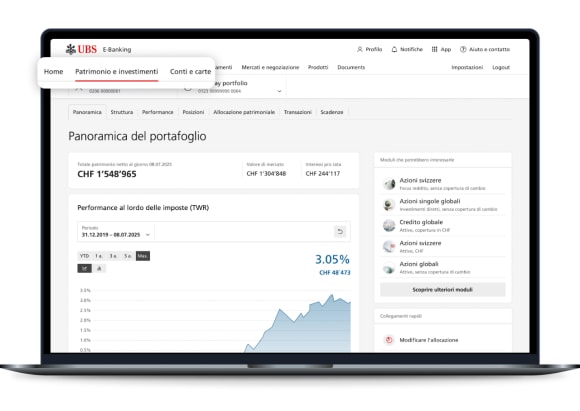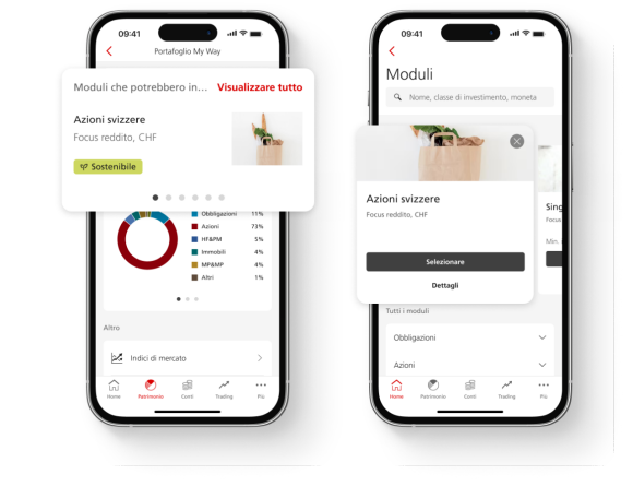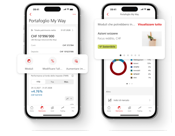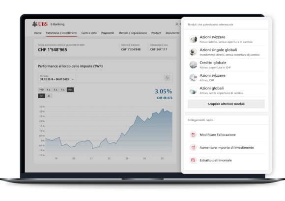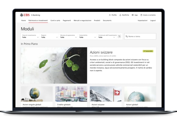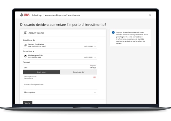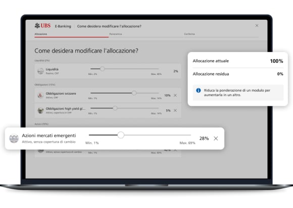 Cambi l’allocazione e aumenti l’importo investito direttamente in UBS E-Banking e Mobile Banking. Scopra nuovi moduli di investimento e li aggiunga in modo semplice al suo portafoglio UBS My Way.
