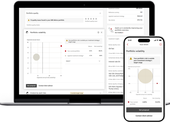 Avec le mandat de conseil UBS Advice, vous bénéficiez d'une surveillance continue de votre portefeuille et d'un accès 24h/24 et 7j/7 à des idées d'investissement exclusives pour garantir la qualité de votre portefeuille. Recevez une notification dès que nous découvrons un potentiel d'optimisation.